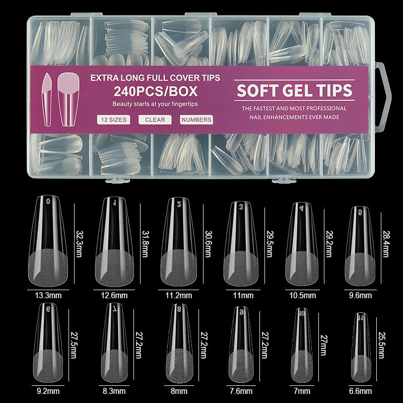 Premium semi-matte soft gel tips — 240PCS and 12 sizes of full-cover for salon-quality extensions.