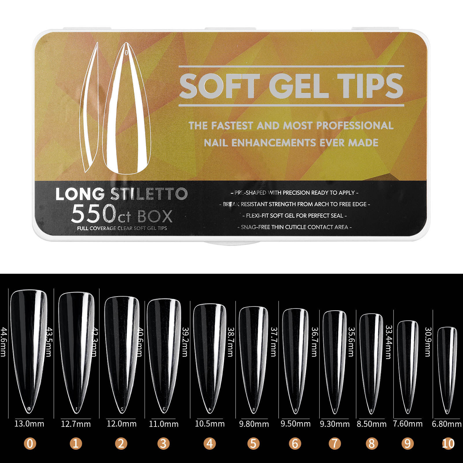 Premium transparent soft gel tips — 550PCS and 11 sizes of full-cover for salon-quality extensions.