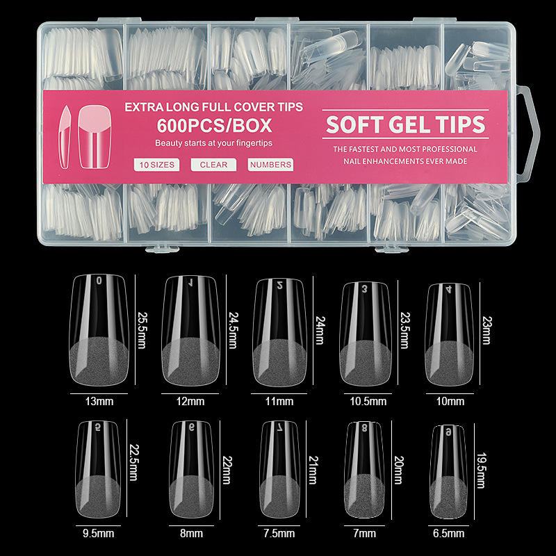 Premium semi-matte soft GelY tips — 600PCS and 10 sizes of full-cover for salon-quality extensions.